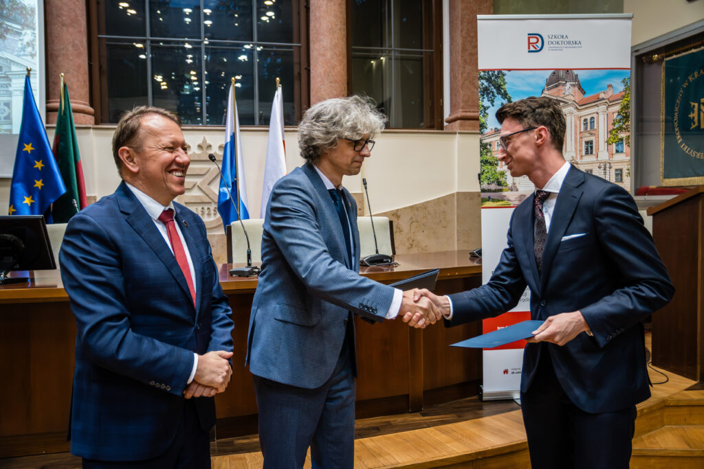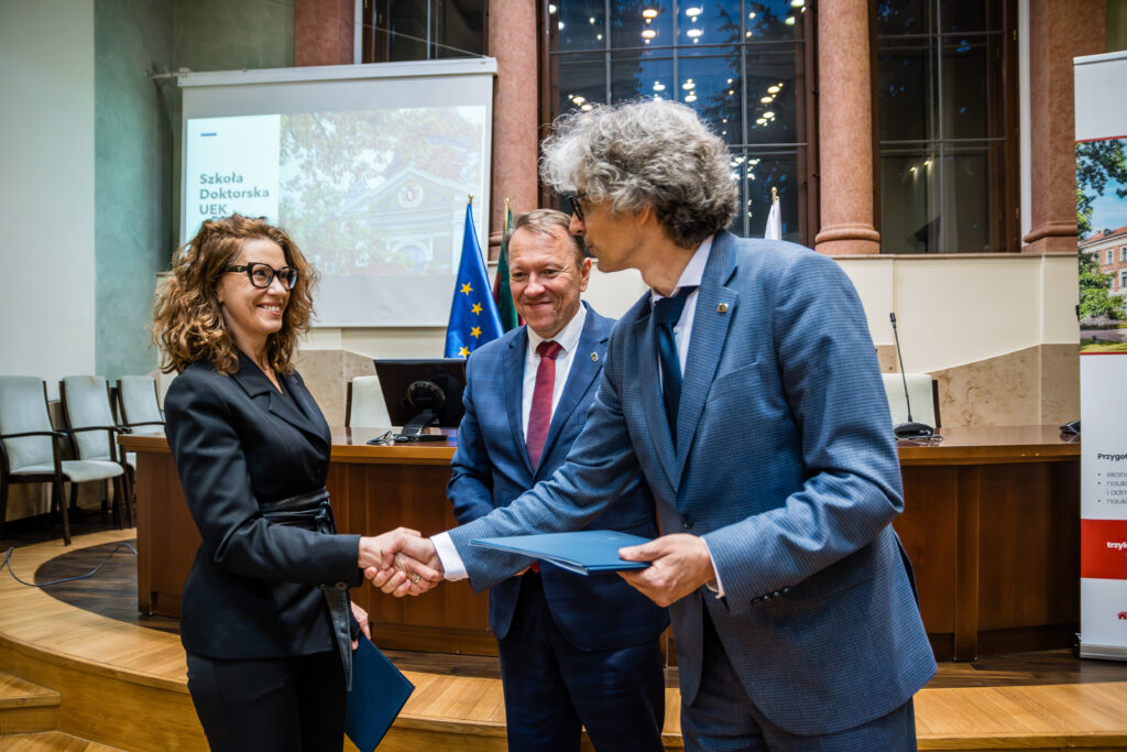 Podczas spotkania Rektorzy złożyli gratulacje nowoprzyjętym doktorantom oraz ich opiekunom naukowym, a także wręczyli dokumenty potwierdzające wpis na listę uczestników Szkoły Doktorskiej UEK.